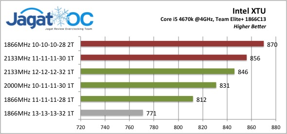 Dari graph bisa terlihat usaha overclocking kami menghasilkan peningkatan performa yang lumayan signifikan. Pada benchmark Intel XTU yang cukup memory-intensive, DDR3-1866 MHz dengan timing ketat(CL10) mendapatkan hasil tertinggi, walaupun tidak stabil lolos LinX. Jadi, konfigurasi DDR3-2133 CL12 masih menjadi konfigurasi terstabil yang paling optimal.