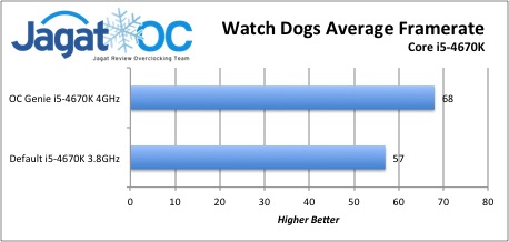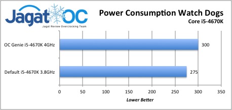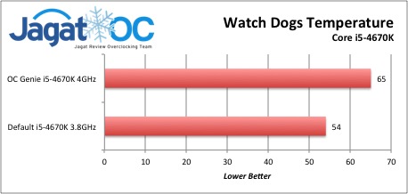 Walau diiringi oleh kenaikan suhu operasi, setting yang diberikan OC Genie masih dapat ditoleransi oleh sebuah HSF Tower kecil seperti Noctua NH-U12S. Salah satu yang membuat performa game Watch_Dogs meningkat cukup baik adalah bagaimana OC Genie juga menyalakan XMP(Xtreme Memory Profile) dari memori DDR3 kami. Peningkatan total sekitar 20% pada average FPS game test ini dibayar, dengan peningkatan suhu prosesor sekitar 11 C, dan peningkatan daya rata-rata 25 Watt(dari total 275 Watt default), masih cukup wajar menurut kami.