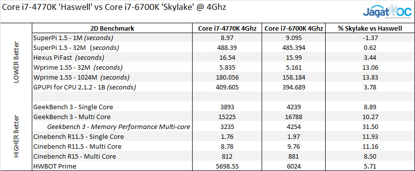 Pengujian di atas memperlihatkan perbedaan performa antara Intel Skylake dan Haswell pada clock yang sama persis (4Ghz). Dan secara mayoritas, perbedaan sekitar 8-10% hanya terjadi pada bagian benchmark 2D yang mengedepankan CPU, sedangkan pada benchmark 3D perbedaannya minim. Ini juga memperhitungkan bahwa Skylake memiliki keunggulan memory bandwidth karena menggunakan DDR4-2133 CL15 (melawan DDR3-1600 CL11 pada haswell).