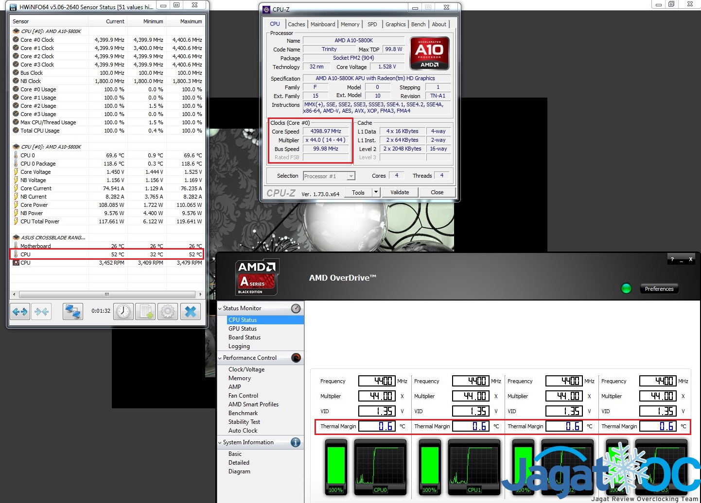 Anda bisa lihat di bagian ‘Sebelum Throttling’, di AMD OverDrive menunjukkan 0.6 C sebelum menyentuh suhu maksimal, sedangkan di bagian sensor motherboard, suhu CPU ada di 52 C. Prosesor masih berjalan di kecepatan penuh, sekitar 4.4Ghz(karena diOC).