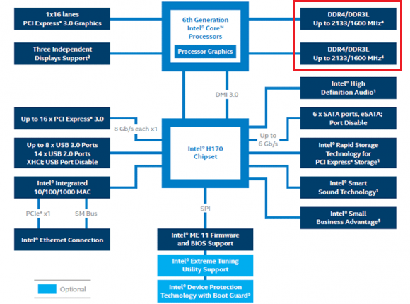 Anda bisa lihat di sebuah block diagram di atas, bahwa kecepatan RAM DDR4 di platform Skylake dengan chipset H170 di-limit ke DDR4-2133 atau DDR3L-1600, meski prosesor yang digunakannya mampu mengoperasikan RAM dengan kecepatan DDR4-4000 atau lebih.