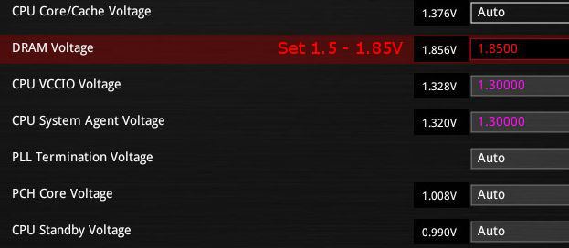 - Setting DRAM Voltage ke 1.5 – 1.85V.