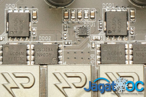 Yang cukup menarik di sini adalah penempatan satu-phase dari CPU VCore rail yang diletakkan dekat mosfet SoC, setidaknya ini memberikan thermal balance lebih baik secara keseluruhan dan bisa sedikit menjaga suhu mosfet CPU saat beroperasi dibandingkan kalau semua mosfet di rail CPU Vcore dikumpulkan berbarengan pada heatsink VRM-nya. Penggunaan konfigurasi 1x ONSEMI 4C10N(high-side) dan 2x ONSEMI 4C06N (low-side) per-CPU phase nampak juga pernah digunakan Gigabyte pada beberapa seri motherboard lain, seperti AB350 Gaming 3.