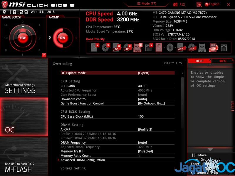 Sama seperti platform Intel untuk mencapai kecepatan RAM ini sesuai rating pada box-nya, maka setting A-XMP pada menu di BIOS harus diaktifkan. Proses mengaktifkan profile A-XMP RAM ini sangat mudah pada motherboard MSI X470 Gaming M7 AC: Anda hanya perlu masuk ke TAB OC dan memilih untuk mengkatifkan menu A-XMP. Dengan memillih opsi Profile 1 atau Profile 2. Sebagai catatan, profil hanya akan ditemukan jika Anda menggunakan memori ini pada motherboard AMD milik MSI. Load profile 2 untuk mengatifkan kecepatan DDR4 3200 dengan timing CL16-18-18-36: