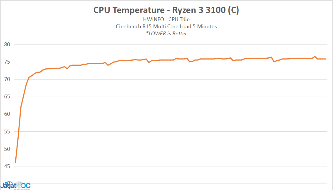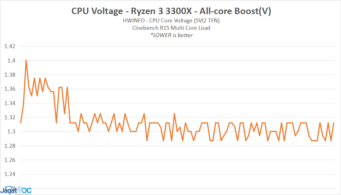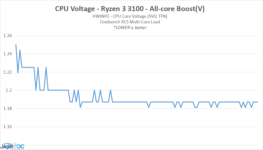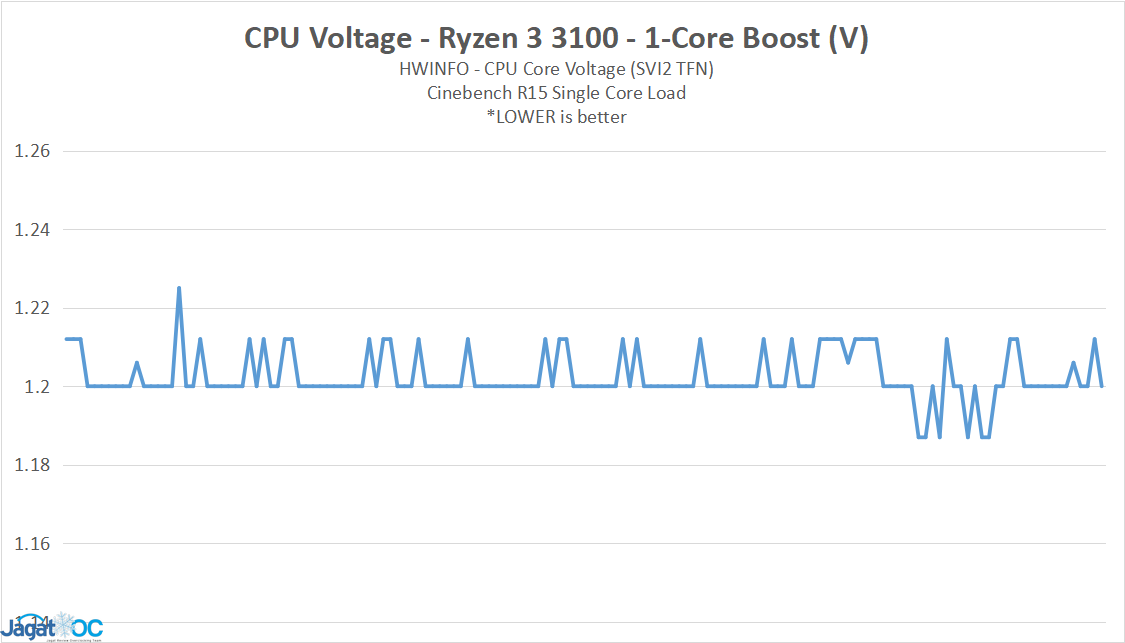 Cukup jelas terlihat bahwa karakteristik clock/voltage Ryzen 3 3100 diset pada setting yang agak rendah, yakni 1.2-1.22v untuk up to 3.9Ghz Boost single-core, berbeda dengan Ryzen 3 3300X yang cukup di-push pada sekitar 1.32-1.34v untuk 4.3 Ghz Boost Single-Core.