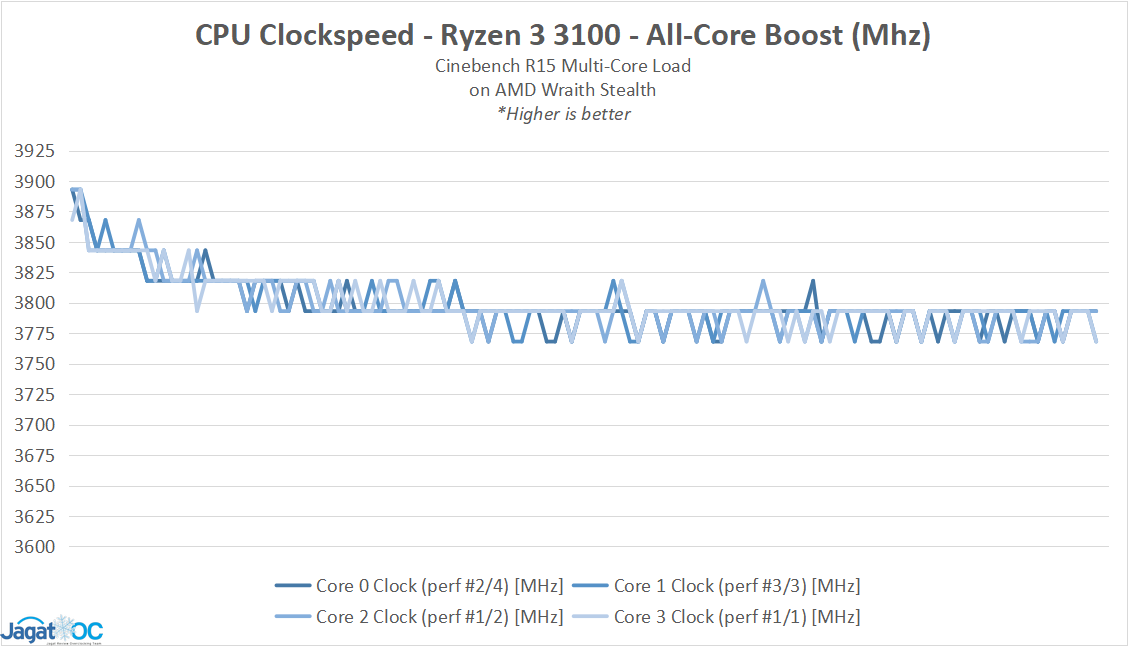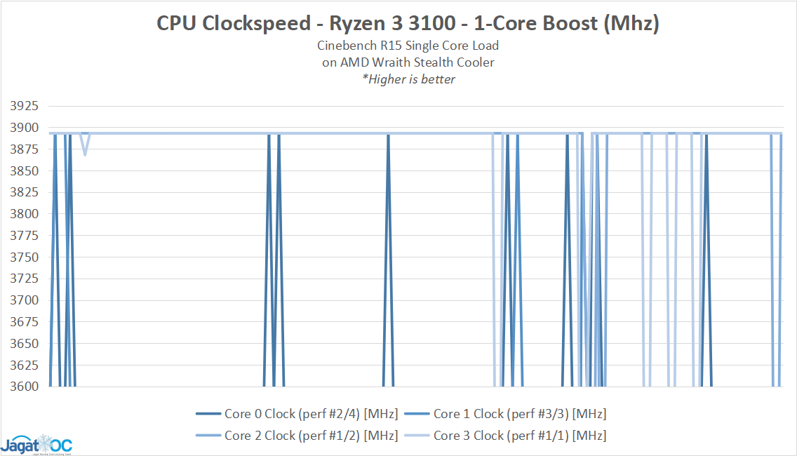 Yang perlu dicatat adalah bagi kedua prosesor ini, single-core boost terjadi cukup sering dan konstan, agak beda dari Ryzen high-end seperti 3900X yang hanya bisa sesekali menyentuh clockspeed boost maksimalnya.