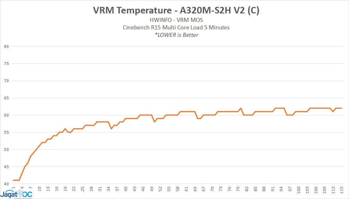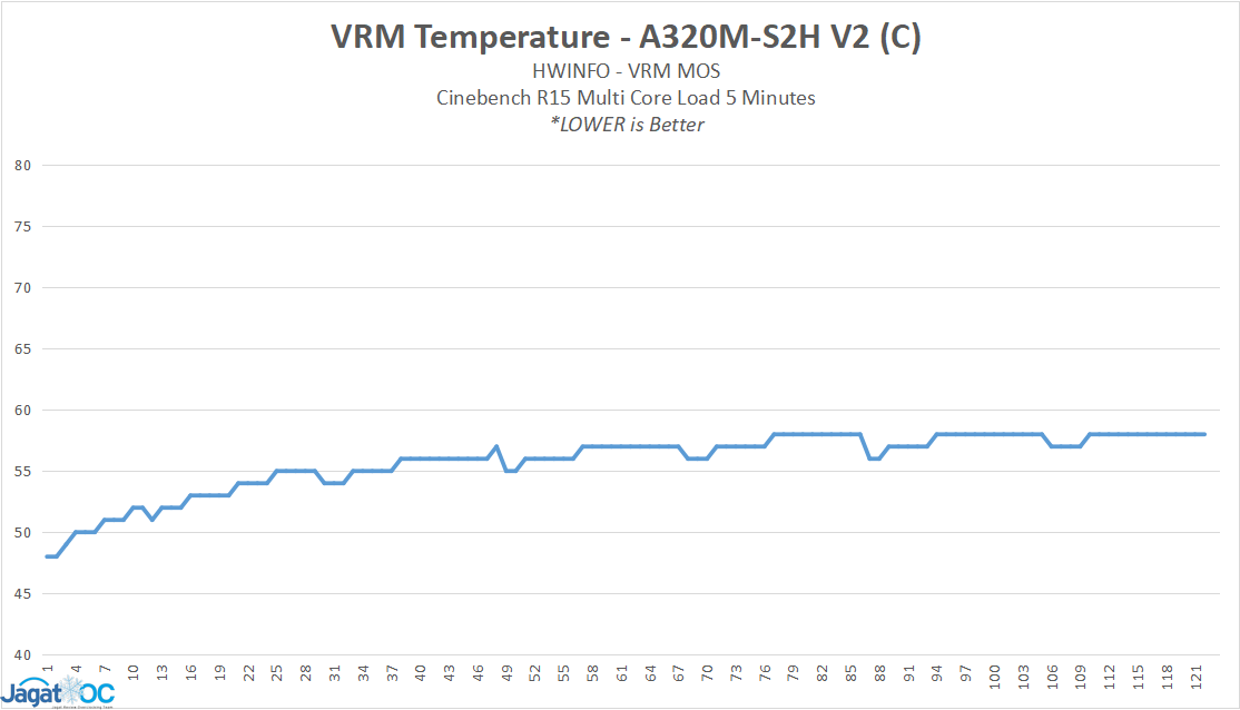 Suhu VRM pada Mobo A320M-S2H V2 yang tidak memiliki heatsink MOSFET sempat kami jadikan ‘tersangka’ atas penurunan clockspeed CPU saat boost all-core, namun pembacaan suhu menyatakan bahwa suhu VRM MOSFET masih sangat sehat pada kisaran di bawah 70 C pada kedua prosesor.