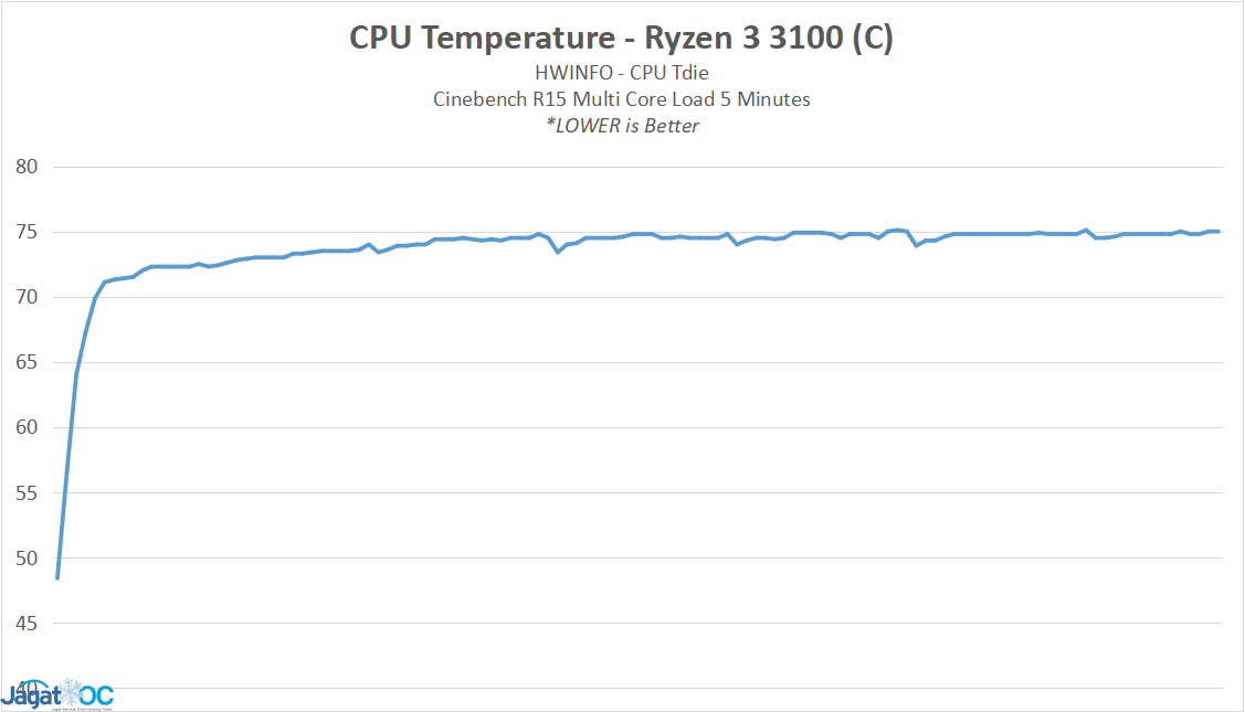 Yang unik, kedua prosesor menyentuh suhu 75C, dan bertahan di sana. Kami mulai berasumsi bahwa prosesor ini sengaja ‘dijaga’ di 75C untuk alasan kestabilan, dan menurunkan clockspeed begitu temperatur mencapai limit tertentu.