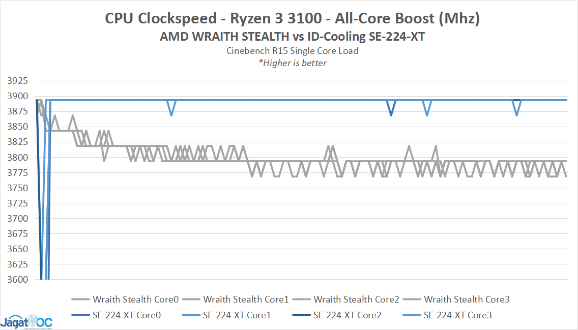 Ada perbedaan performa sekitar 3% antara penggunaan stock cooler wraith stealth dengan SE-224XT.